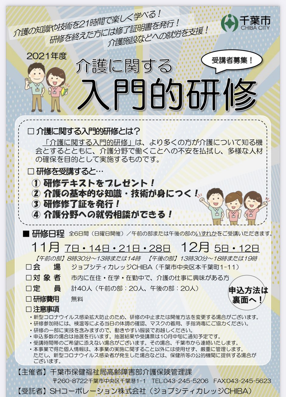 | お問い合わせ | 研修実施者(受託者) SHコーポレーション株式会社(ジョブシティカレッジCHIBA) 申込・問合せ先 千葉市保健福祉局高齢障害部介護保険管理課 企画班 住所:〒260-8722 千葉市中央区千葉港1-1 電話番号:043-245-5206 FAX:043-245-5623 |